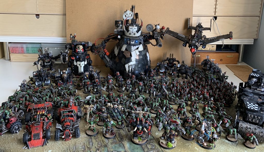 Fast forward several years and I started playing X-wing with a group of colleagues. Some of us went to the UK Games Expo, where centre stage 8th Ed 40k was being demonstrated, and that was the dawn of the second age! I played 40k Orks through 8th and a bit of 9th, and I dabbled in Necromunda (Delaque) and Horus Heresy (Iron Warriors). I also played a few historical games like Black Powder. Most recently I have played a couple of games of Adeptus Titanicus (Legio Gryphonicus) and The Old World (Orc & Goblin Tribes).